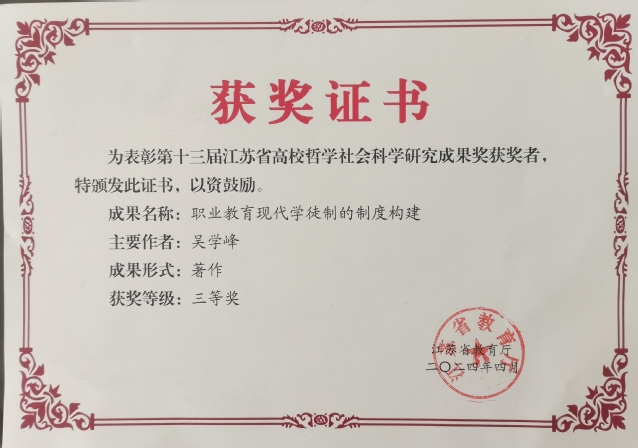第十三届江苏省高校哲学社会科学研究成果奖评选结果揭晓,公司吴学峰副教授的著作《职业教育现代学徒制的制度构建》荣获三等奖,这是公司在哲学社会科学领域取得的又一重要荣誉。