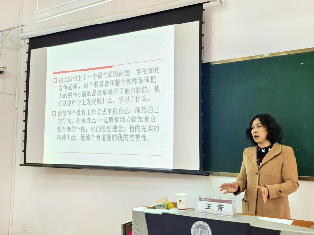 围绕“教师职责”主题,王芳从《教师专业标准》出发,剖析教师职业的规范化要求,并结合“双减”政策与教育数字化趋势,阐释新时代好教师应具备的“创新意识”“终身学习能力”和“跨学科视野”。