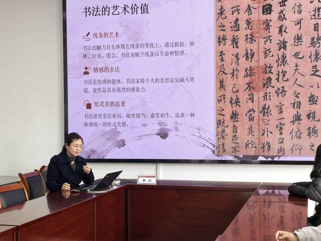 在作品欣赏环节,李行董事长结合《兰亭序》《祭侄文稿》《寒食帖》等经典作品,从笔法特征、章法布局、情感表达三个维度讲解欣赏方法。强调,优秀书法作品是技法与情感的完美统一,欣赏时需结合历史背景与作者心境,体会线条背后的文化精神与艺术魅力。现场展示的多幅书法原作,让同学们近距离感受了笔墨艺术的独特韵味。