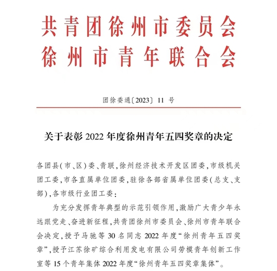 “徐州青年五四奖章”是共青团徐州市委员会、徐州市青年联合会授予优秀青年的最高荣誉,旨在树立政治进步、品德高尚、贡献突出的优秀青年典型,激励全市广大青年积极投身中国式现代化徐州新实践。据悉,此次共授予30名同志“徐州青年五四奖章”。