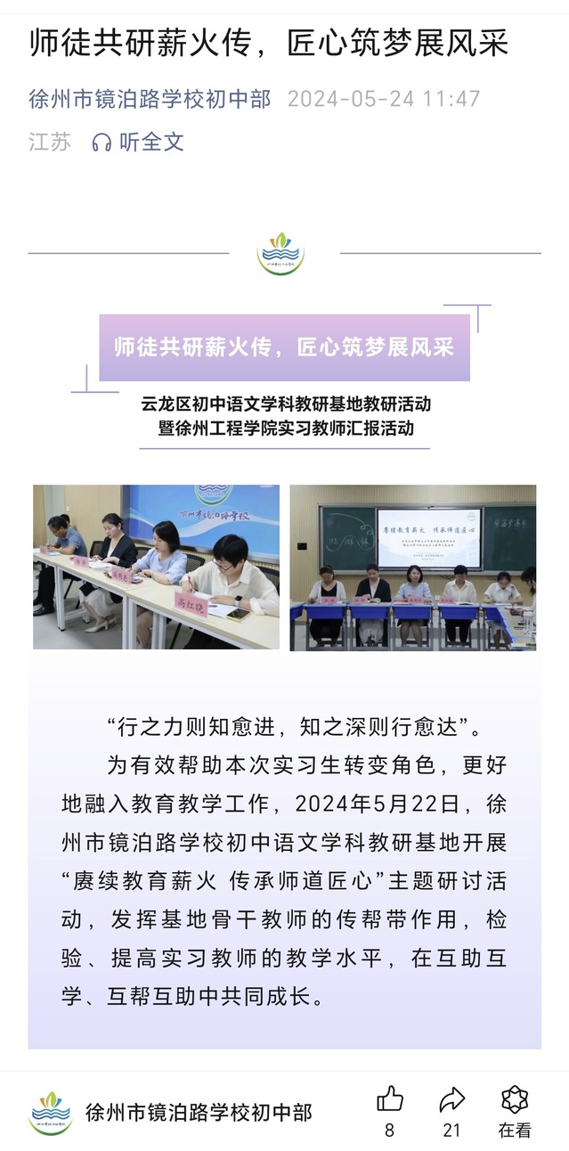作为从“师范生”向“实习教师”的身份转换,在实习导师引领、指导下,同学们积极思考把专业理论知识融会贯通到中学语文教学、中学班级管理中去,通过接触到的多种不同课型、课堂教学秩序的管理、师生的交流等,不断反思自己的教学行为和效果,反思和总结经验,不断提高自己的教学技能和教育理念,锻炼自己的沟通能力和组织能力。其中,在镜泊路公司初中语文学科教研基地还开展了“赓续教育薪火 传承师道匠心”的主题研讨活动,通过实习教师与带教老师同课异构课堂教学、评课交流等主题活动,检验、提高实习教师的教学水平,也发挥基地骨干教师的传帮带作用,营造互助互学的浓郁教学氛围,效果显著。