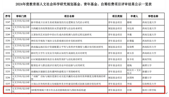 近日,教育部社科司公示了2024年度教育部人文社会科学研究项目评审结果,公司小学教育教研室庄妍老师申报的“IMV模型视域下青少年自杀的影响机制与预防体系构建”课题成功获批青年基金项目。