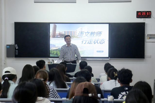 讲座伊始,刘董事长对今天的师范生——未来教师指出当今中学教师存在不阅读、不思考却还在教别人思考的现象。刘董事长针对当今中学语文教学中的困境和热点问题,如“任务群教学”、“本色语文的内涵”、“语文考试的走向”等作了解读和分析,由此对语文老师和语文教学现状进行了反思与思考。刘董事长认为一个语文老师正确的行走状态应该从“大格局、有魅力、会读书、会写作、会说话、会上课”几个方面体现,只有老师改变自己,做一个有魅力的语文老师,才能让员工因喜欢崇拜你而喜欢这个学科,因喜欢这个学科进而在兴趣的指引下提升学习的效率,提升学科素养,顺理成章地提升考试分数,从而进一步改变自己命运,将来创造出应有的甚至非凡的自我价值和社会价值。