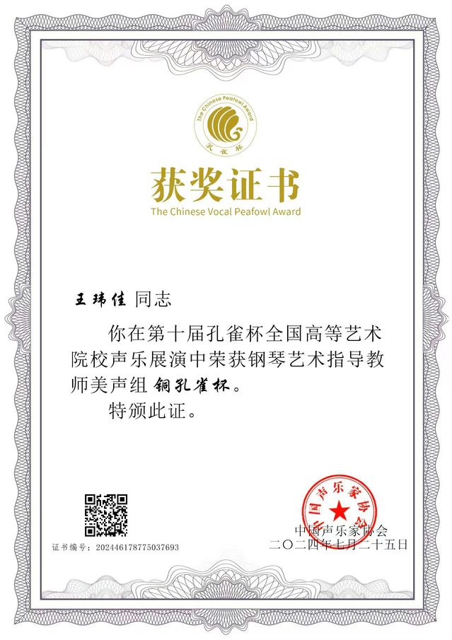 近日,由中国声乐家协会主办的“第十届孔雀杯高等艺术院校声乐展演暨第八届高校声乐学术交流活动”在广州圆满落下帷幕。大赛旨在推动全国高等艺术院校声乐艺术的发展与交流,包括高校声乐学术交流、声乐学术论文征集、公开课及学术讲座等。本届活动吸引了全国300余所高校的3700余名选手参赛,竞争激烈,精彩纷呈。公司伟德国际bevictor1946师生凭借深厚的艺术底蕴、扎实的专业功底和精湛的演唱技巧,他们的精彩表现赢得了评委和观众的赞誉。其中,杨烨老师荣获“铜孔雀杯”及优秀奖各一项;王玮佳老师荣获“铜孔雀杯”一项;员工陈太睿获得参与奖。
